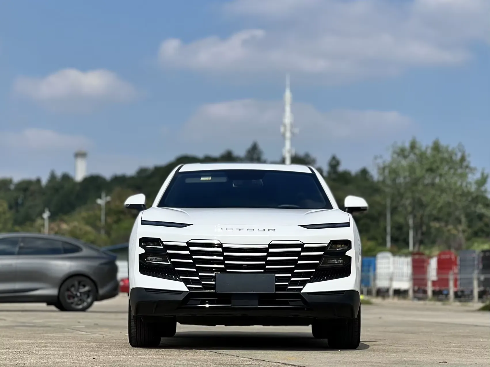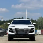 Il s’agit d’un SUV de la marque chinoise Jetour, présenté dans une élégante teinte blanche. Le véhicule affiche un design contemporain et dynamique, caractérisé par une calandre avant imposante aux lignes horizontales chromées, des phares effilés et des jantes bicolores au style sportif. Ses passages de roues élargis, son toit fuyant et ses protections latérales noires lui confèrent un look robuste et moderne. C’est un SUV urbain au style affirmé, alliant esthétique soignée et allure premium.